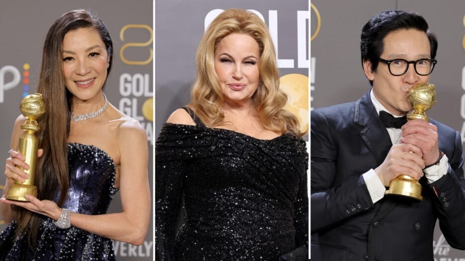 Слева направо: Мишель Йео, Дженнифер Кулидж и Ке Хай Цюань на церемонии вручения премии «Золотой глобус» 2023 года (Getty Images)