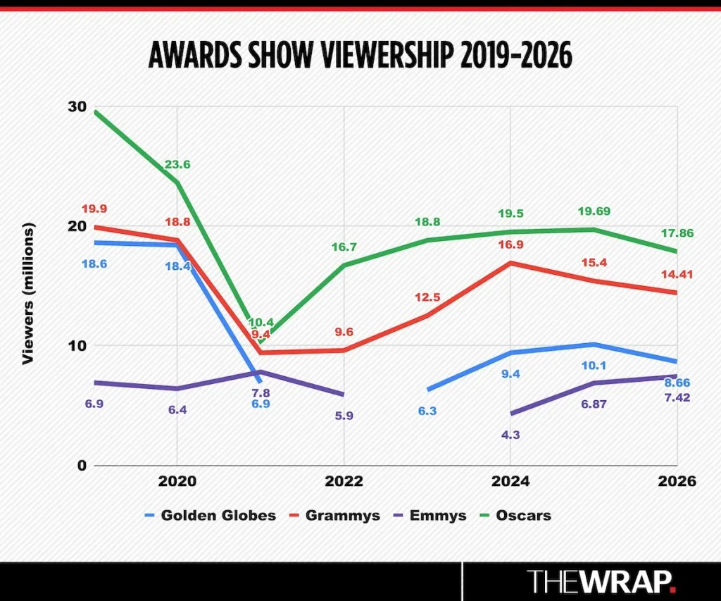 Тенденции противостояла премия «Эмми» 2025 года, которая занимает неудобное место, но для целей этой истории будет учтена в сезоне наград 2026 года. В сентябре аудитория премии «Эмми» выросла на 8% и достигла самой просматриваемой церемонии с 2021 года с 7,42 миллиона зрителей, продолжая восстанавливаться после того, как в январе 2024 года она достигла рекордно низкого уровня в 4,3 миллиона зрителей за отложенное из-за забастовки шоу. Еще одна церемония «Эмми» состоялась всего шесть месяцев спустя, в сентябре 2024 года, которая заметно выросла и достигла 6,87 миллиона зрителей, за годичный перерыв перед шоу в сентябре 2025 года. возможно, дал бы зрителям возможность вздохнуть и снова насладиться самой большой ночью телевидения.
