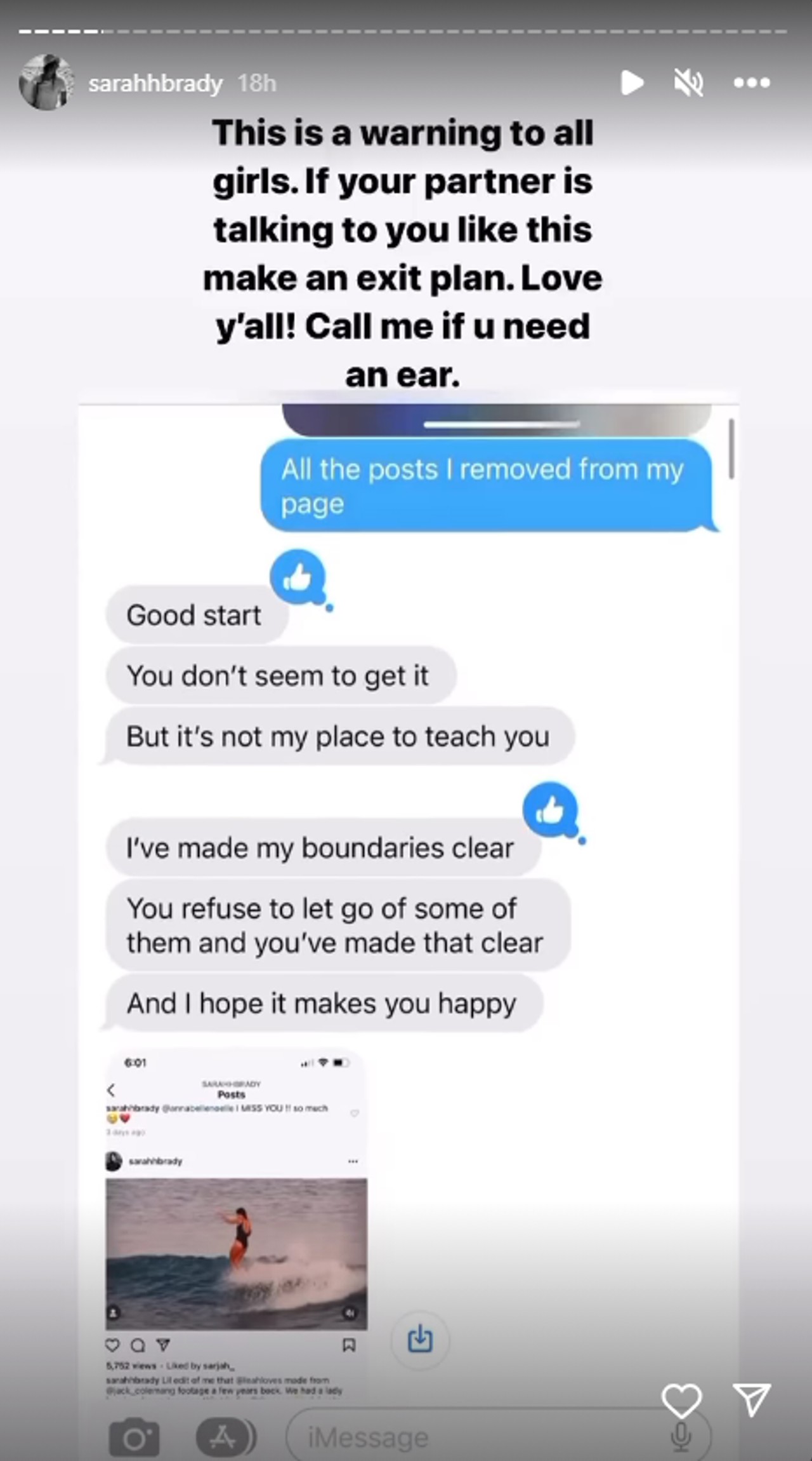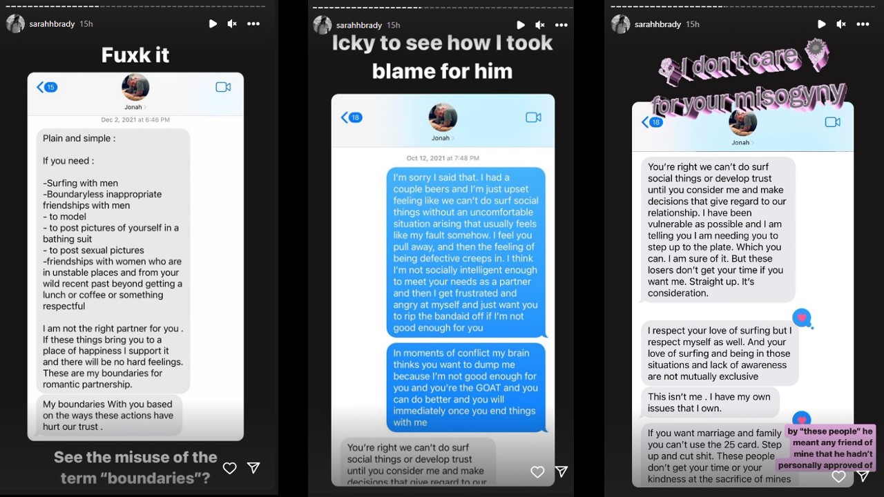 Brady postete weiterhin angebliche Textnachrichten von Hill und lud Nachrichten hoch, die er ihr angeblich über ihren Instagram-Feed und ihre angebliche „Einstellung zur Surfkultur“ geschickt hatte.