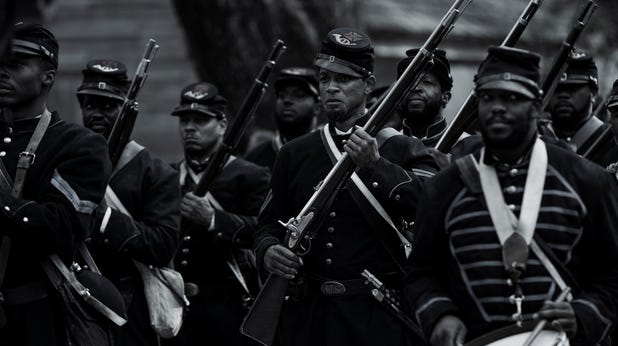 Da er als nahezu messianisch gilt, überlebt Peter den Bayou und findet seinen Weg nach Baton Rouge, wo er sich der rein schwarzen 1. Louisiana Native Guard anschließt. Die anschließende Schlacht, in der Peter von einem schwarzen Kapitän (Mustafa Shakir) angeführt wird, dient als mitreißende Aktualisierung des faktenbasierten Films von 1989 Ruhm wo ein weißer Oberst (Matthew Broderick) ein rein schwarzes Infanterieregiment aus dem Bürgerkrieg in den ehrenvollen Tod führte. Hier marschiert Peter in Uniform neben nur Kämpfern der Black Union und gewinnt dann fast im Alleingang die Schlacht, eine weitere Anspielung auf das reduzierende Heldenkino, das die Befriedigung darüber verschleiert, dass Peter die von der Regierung genehmigten Waffen gegen diejenigen ergreift, die ihn gequält haben. Dieser blutgetränkte Endkampf ist der Schlussstein für den erstklassigen Beitrag des Kameramanns Robert Richardson. Er bewegt die Kamera in weiten, schwungvollen Bewegungen, um die Ungeheuerlichkeit der düster authentischen Schlachtfelder des Bürgerkriegs der Produktionsdesignerin Naomi Shohan einzufangen. Diese Drohnen- und Kranaufnahmen sind riskant, weil sie die Intimität der Nähe zu Peter zerstören, aber sie sind zu eindringlich schön, um nicht zu funktionieren. Die Farbpalette des Films besteht größtenteils aus Schwarz und Weiß, nur gelegentlich schimmern Farbtupfer durch. In einem der verstörendsten Momente des Films schreit ein junges weißes Mädchen, das deutlich in Rot gekleidet ist, „Läufer“, als sie sieht, wie Peter unbefugt die Plantage ihrer Familie betritt.