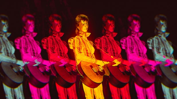 Morgens Standhaftigkeit, sich zu weigern, für einige (die meisten!) dieser visuellen Kontrapunkte einen Kontext anzubieten, ist nach Meinung dieses Kritikers ein Allheilmittel gegen langweilige Dokumentarfilme. Es geht noch weiter, mit krampfhaften Trips durch assoziative Bilder. Ein altes Interview mit Bowie, in dem er über die Kunst des Auftritts spricht (mit Details zur Ziggy Stardust-Persönlichkeit), fügt Clips ein Metropole, Mickey Mouse, Buster Keaton, kitschige Science-Fiction der 50er Jahre und echte Bilder aus dem Weltraum in den Mixer. Es ist großartig, weil es auf diese coolen Gitarrenlicks von Mick Ronson abgestimmt ist und immer einen Groove findet. Aber das Publikum, das etwas mehr Klarheit sucht, könnte denken: „WWas zum Teufel schaue ich da?“