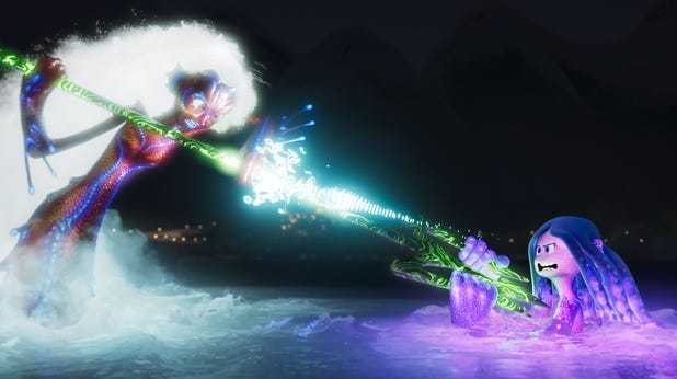 Which is to say, while there is plenty to enjoy here, the tone and tenor of this DreamWorks flick struggles to straddle the line between the kookiness of its premise (I mean, this family is called GILL-man, get it?) and the sincerity of its emotion (here’s where Fonda and Collette’s voice work does some serious heavy lifting). Visually, at least, Ruby Gillman, Teenage Kraken is a treat. Playing with the Play-Doh-like plasticity of the medium (even when it makes its titular creatures look, at times, like neon gummy-like Sea Monkeys), director Kirk DeMicco and co-director Faryn Pearl constantly find ways of making you wish you could pause to truly take in their immersive world-building. An early scene featuring a smorgasbord of promposals, for instance, may come close to overloading your senses but it nevertheless begs to be dissected frame by frame to savor every one of its jokes. One wishes such playful inventiveness was as evident in the film’s final climactic battle which can’t help but pale in comparison to the similarly staged scene in 1989’s The Little Mermaid (and not just because it also features a mermaid, a trident, a ship in peril, and a stormy backdrop).