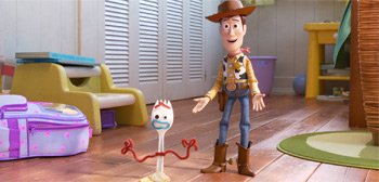 Geleitet von Josh Cooley (Drehbuchautor von Pixar von innen nach außen), Toy Story 4 sieht umwerfend aus. Während frühere Einträge der Serie ein Seitenverhältnis von 1,85:1 verwendeten, Toy Story 4 hat umgestellt auf 2,39:1, ein anamorphotisches Breitbildformat, das für ein filmischeres Erlebnis sorgt. Manchmal ist die Animation fast fotorealistisch – die Spielzeuge und ihre Umgebung sind einfach unglaublich detailliert und strukturiert. Die Charakteranimationen – Körperbewegungen, Gesichtsausdrücke – sind ebenso beeindruckend. Hier ist Technologie keine Krücke – sie ist ein Werkzeug – und in Kombination mit der Arbeit talentierter Schauspieler wie Hanks, Potts und Hendricks entsteht pure Filmmagie. Woody, Bo Peep und Gabby haben so viel emotionale Tiefe, dass sie sich echt anfühlen; Von Seelen durchdrungen und mit existenzieller Angst ringend, beginnt der Animationsfilm, mich zu verlieren. Forky, eine Ansammlung von Eisstiele, Glitzerkleber, Pfeifenreinigern, Plastikbesteck und Kulleraugen, hat so große Angst um seine eigene Existenz, dass er selbstmordgefährdet ist. Forky erklärt sich selbst zum „Müll“ und versucht immer wieder, sich in den Müll zu werfen, was Woody dazu zwingt, einzugreifen und ihm zu versichern, dass er nicht wegwerfbar ist.