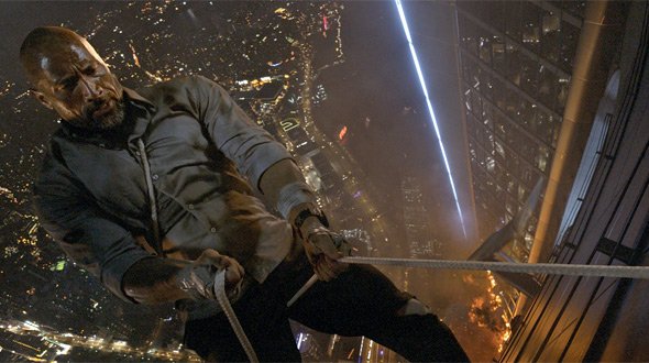 Wolkenkratzer ist ein Film, der einen herausfordert, es ernst zu nehmen. Es ist hirnloser Eskapismus, aber die übertriebene Action ist so unverfroren absurd dass es unmöglich ist, an alles zu glauben, was man auf dem Bildschirm sieht. In einer unglaublichen Szene klettert Johnson frei auf einen 1.000 Fuß hohen Superkran, manövriert ihn in Position und bricht dann einen Weltrekord, indem er von dort aus einen 30 Fuß langen olympischen Weitsprung in das brennende Gebäude vollführt. Es hilft nicht, dass die Cartoon-Action durch computergenerierte Bilder akzentuiert wird, die den Film wie ein hässliches, unerklärlich langweiliges Videospiel aussehen lassen. In einer anderen Szene fertigt Johnson Handschuhe aus Klebeband an, damit er die Außenseite des selbsttragenden Gebäudes erklimmen kann, um Zugang zu seiner gigantischen Windkraftanlage zu erhalten. Während er unbeholfen den Sims entlang schlurft, murmelt er: „Das ist dumm.“ Ich muss zustimmen.
