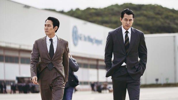 Еще до того, как появилось его название, Охота погружает зрителей в тщательно продуманную сцену с грязной перестрелкой и взорвавшейся гранатой. Пак Пён Хо (Ли), руководитель иностранного подразделения KCIA, и Ким Чжон До (Чон У Сон, Хороший, плохой, странный), начальник внутреннего подразделения KCIA, пытается сорвать заговор с целью убийства президента Южной Кореи во время визита в США. Прошло всего две минуты, и Ли Чжон Чжэ уже разминается, заставляя оператора Ли Мо Гэ выстроить замысловатый кадр, на котором шеф Ким постепенно теряет фокус, когда вращающаяся дверь на заднем плане вращается, показывая шефа Пака, стоящего позади, в фокусе. С самого начала фильм стремится к уровню сложности наравне с Решение уйти. Хотя это не совсем соответствует этому сравнению, приятно видеть, как новичок в кинопроизводстве растягивается таким образом.