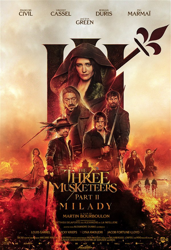 Д’Артаньян (Франсуа Сивиль) вынужден объединить усилия с Миледи (Ева Грин), чтобы спасти Констанс (Лина Худри), которую похитили на его глазах. Но поскольку война объявлена и Атос, Портос и Арамис уже присоединились к фронту, тайна прошлого разрушает старые союзы. Три мушкетера: Миледитакже известен как Les Trois Mousquetaires: Миледи на французском языке, снова режиссер французский режиссер Мартин Бурбулонрежиссер комедийных фильмов Папа или мама и Развод по-французскии Эйфелеваплюс первый Три мушкетера: Д’Артаньян, а также несколько короткометражных фильмов и несколько работ на телевидении. Сценарий написали Матье Делапорт и Александр де Ла Пателльер; по мотивам классического произведения Александра Дюма. одноименный роман. Продюсер: Дмитрий Рассам для главы 2 (Mediawan) + Pathé; сопродюсерами M6 Films, Constantin Film и DeAPlaneta. Пате дебютировал Часть II: Миледи во французских кинотеатрах 13 декабря. Его можно будет посмотреть в США в некоторых кинотеатрах + также на VOD, начиная с 19 апреля 2024 г. Эта весна.